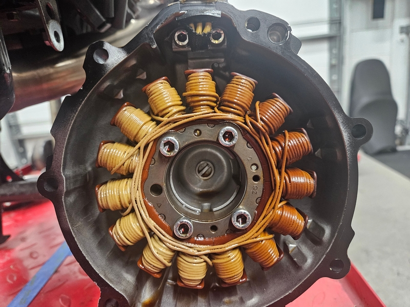 Stator: Will remain at 12.8v when idling or revving engine. This points to stator loops burned out and can no longer produce AC at its peak output.