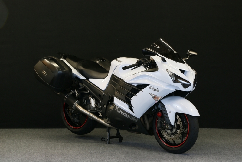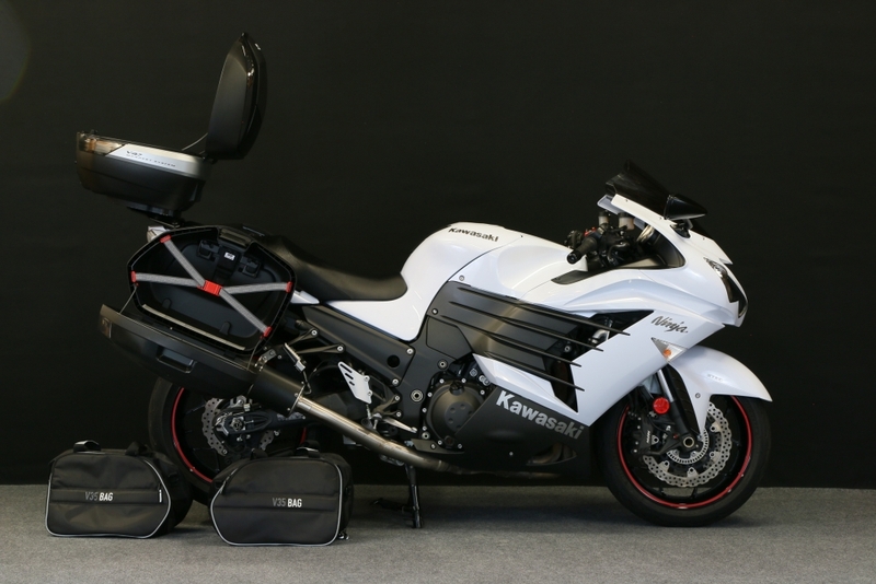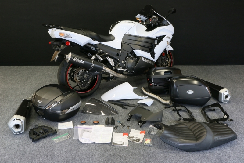 Never drag raced; never abused. Never even ridden two-up (my wife doesn't like bikes). It's set up for sport touring with: Top case (Givi V47) which attaches to the SW-Motech ALU-RACK toprack adapter plate that attaches to the SW-Motech ALU-RACK; side cases (Givi V35's) that attach to SW-MOTECH Quick-Lock EVO Contour Sidecarrier side mount brackets (the top case and side cases are keyed alike which is convenient, and the side case mounts also have locks so somebody can't just easily twist the fasteners and walk away with the cases); slightly taller Puig screen; Helibar 1" handlebar risers; Corbin seat; and Kawasaki center stand. The luggage setup cost around $1,250 new in 2015; I'm not sure it's all still available. One very nice thing about the side case carriers is that the tabs they mount to are small enough as to be barely noticeable when the side cases and mounting carriers are not on; they are on the bike in all of the pics.